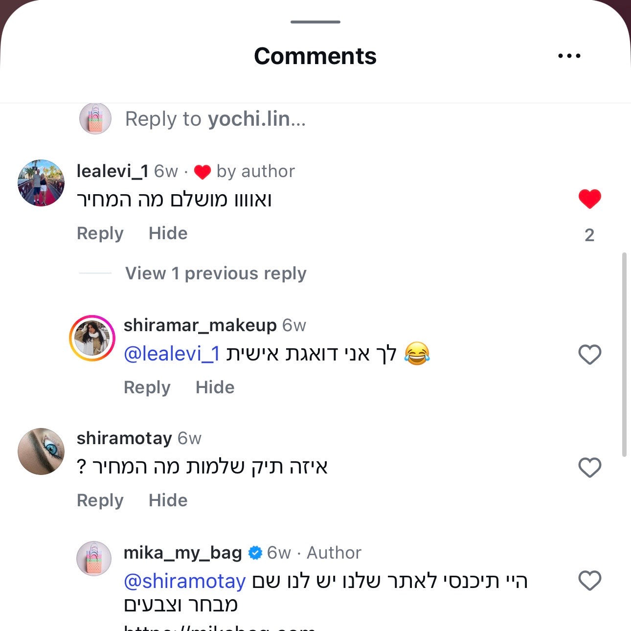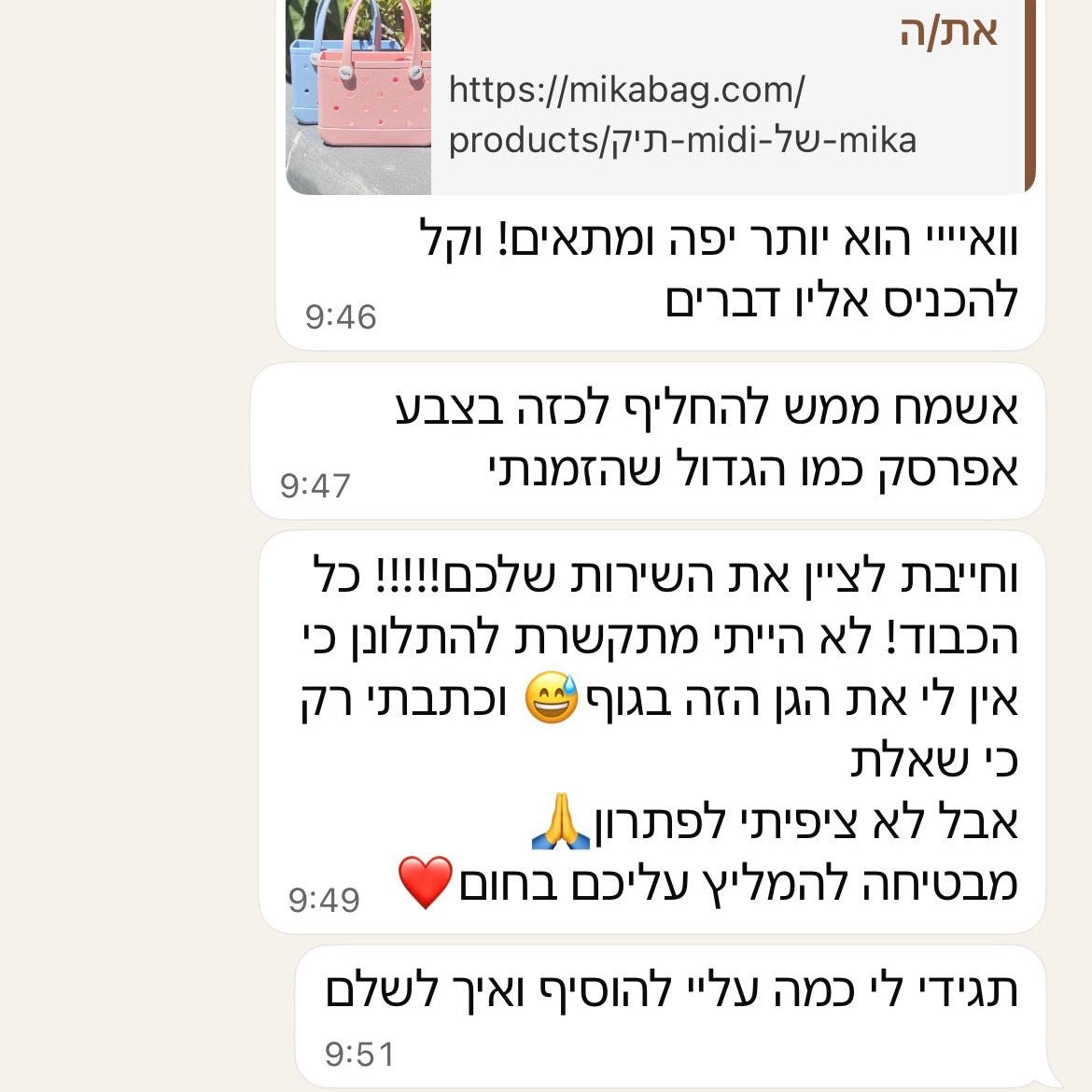 אני רוצה לפרגן! אני אחת שנוסעת הרבה למשפחה, לטיולים בסופ"שים ותמיד הייתי מסתבכת עם כמה תיקים, רכשתי את התיק של מיקה והוא אחד והיחיד שמסדר לי את הבלגן לא יודעת איך הסתדרתי בלעדיו עד היום! ממליצה מכל הלב